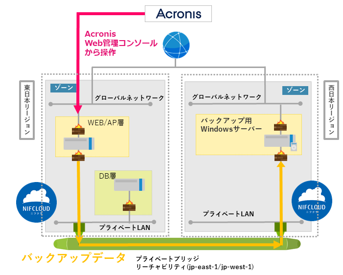ニフクラでは、対応リージョン内のプライベートLAN同士を接続することで、インターネットを経由するよりもセキュアかつ高速に通信を行うことができる「プライベートブリッジ」サービスを2019年12月より提供しています。今回はこのプライベートブリッジを経由し、「Acronis Cyber Protect Cloud」を用いて東日本リージョンに構築したサーバーのバックアップデータを西日本リージョンに構築したサーバーに保存する検証を行いました。