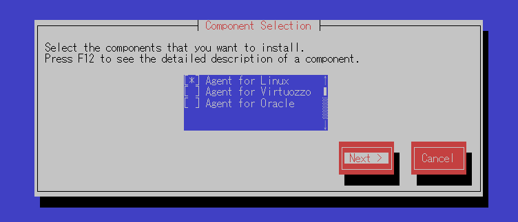 for Linuxを選択しNextを押下します(↑↓キー・Tabキーで選択します) エージェントをセットアップするのに必要なパッケージがない場合はインストールを要求されます