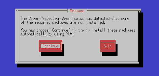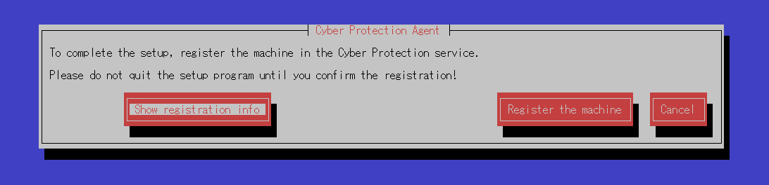 図3. Continueを選択 - セットアップを完了するためにはサーバーをCyber Protection serviceに登録する必要がありますので、