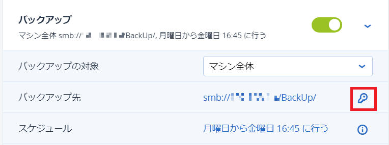 項目 設定内容 バックアップの対象 マシン全体 バックアップ先 //XXX.XXX.XXX.XXX/バックアップ先の共有フォルダ/ スケジュール 月曜日から金曜日 16:15に行う 保持する期間 月単位: 6 月 週単位: 4 週 日単位: 7 日 暗号化 OFF アプリケーションバックアップ 無効 バックアップオプション 変更 XXX.XXX.XXX.XXXでマスクしてあります。 - さらに、