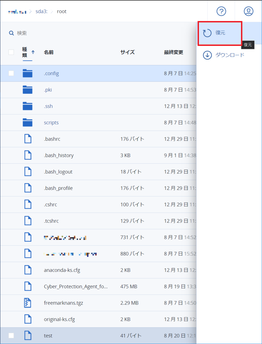 図18. 「ファイル/フォルダ」を選択 sda3→root→test→復元