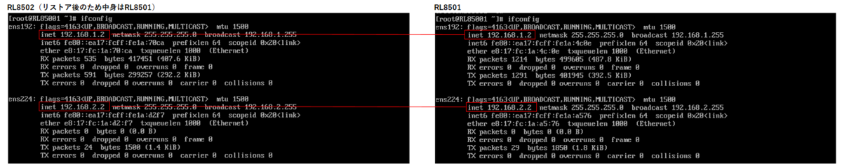 リストアを行ったRL85002(中身はRL85001)と、バックアップ実施前のRL85001のifconfigの比較