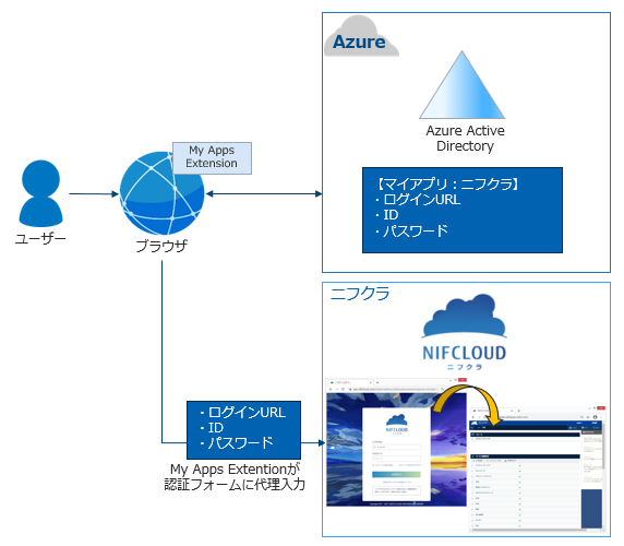 アプリ内の認証情報(今回はFJcloud-V(旧ニフクラ)アカウント情報)とAzure ADのユーザーが紐づけられることで、SSOが可能になります。