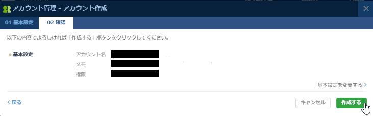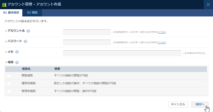 ①-3 『アカウント管理 - アカウント作成』の『01 基本設定』でアカウント、パスワード、メモ、権限を入力/選択後『確認へ』を選択する。