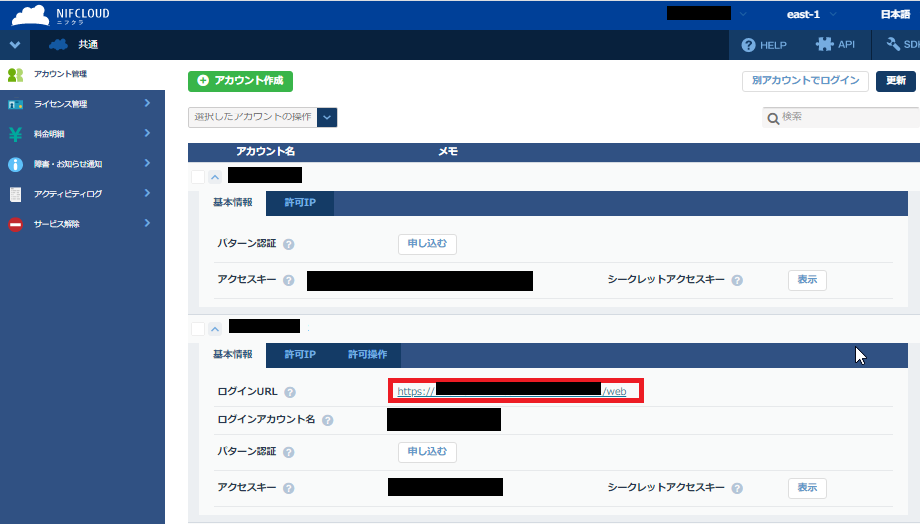 ※子アカウントを作成後、アカウントの基本情報から「ログインURL」を確認しておきます。このURLは後続の設定で使用します。