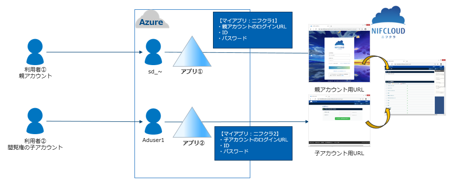 FJcloud-V(旧ニフクラ)のマルチアカウントは親アカウントと子アカウントでログインURLが異なるため、それぞれにアプリを作成する必要があります。