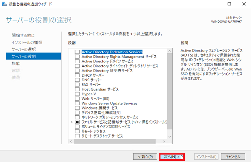 役割と機能の追加ウィザード - 8. 『次へ(N)>』を選択