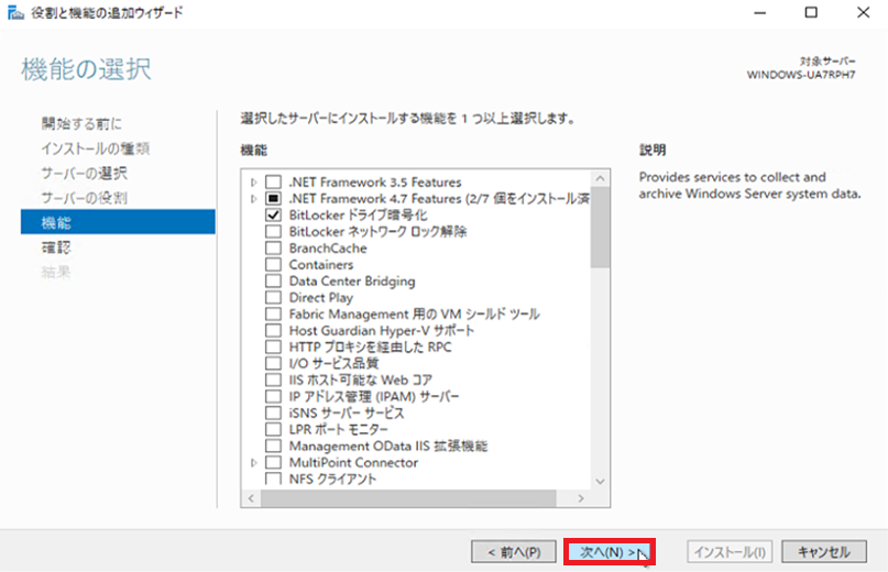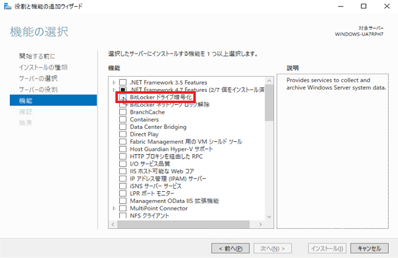 サーバーの役割の選択 - 6. 『BitLocker ドライブ暗号化』にチェックを入れる