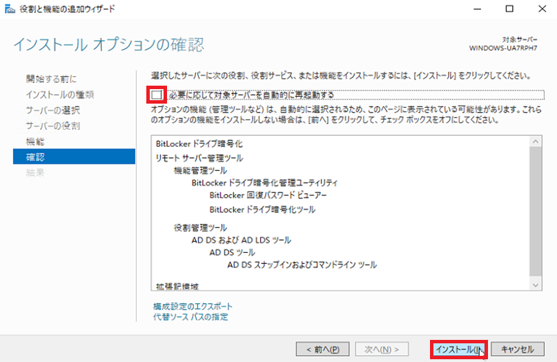 機能の選択2 - 9. 『必要に応じて対象サーバーを自動的に再起動する』のチェックを外す。『インストール(I)』を選択