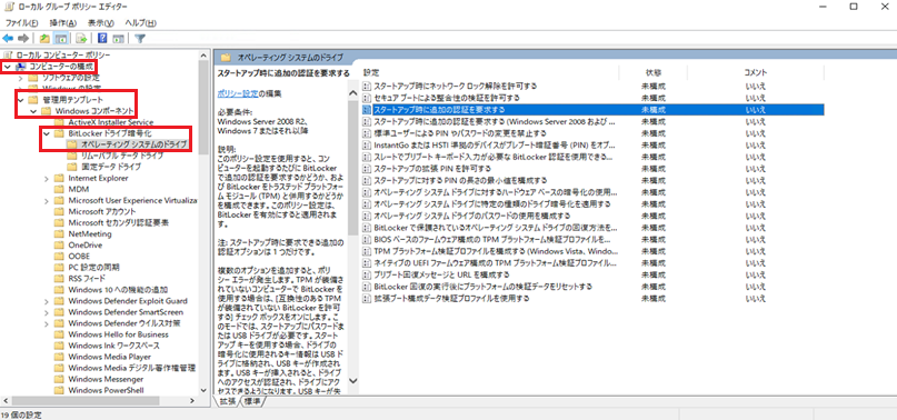 - 『ローカルグループポリシー』>『コンピューターの構成』>『管理用テンプレート』>『Windows コンポーネント』>『BitLocker ドライブ暗号化』>『オペレーティング システムのドライブ』を選択