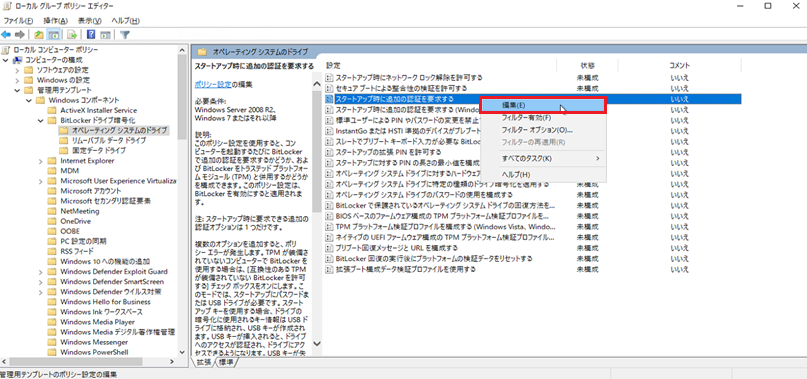 ローカルグループポリシー設定1 - 2. 『スタートアップ時に追加の認証を要求する』を選択後『編集(E)』を選択