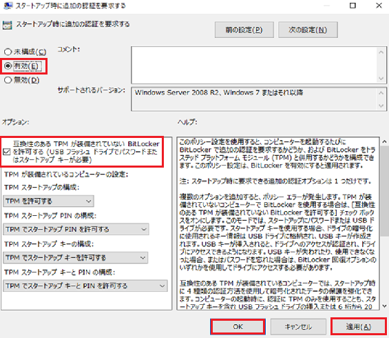 ローカルグループポリシー設定2 - 3. 『有効(E)』を選択後オプション:の『互換性のあるTPMが装備~』にチェックが入っていることを確認。『適用』を選択後『OK』を選択