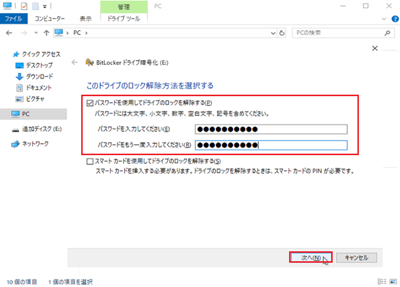 BitLocker有効化 - 2. 『パスワードを使用してドライブのロックを解除する(P)』にチェックを入れパスワードを入力。『次へ(N)』を選択
