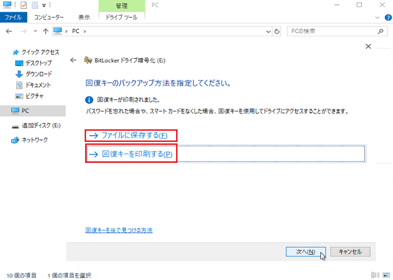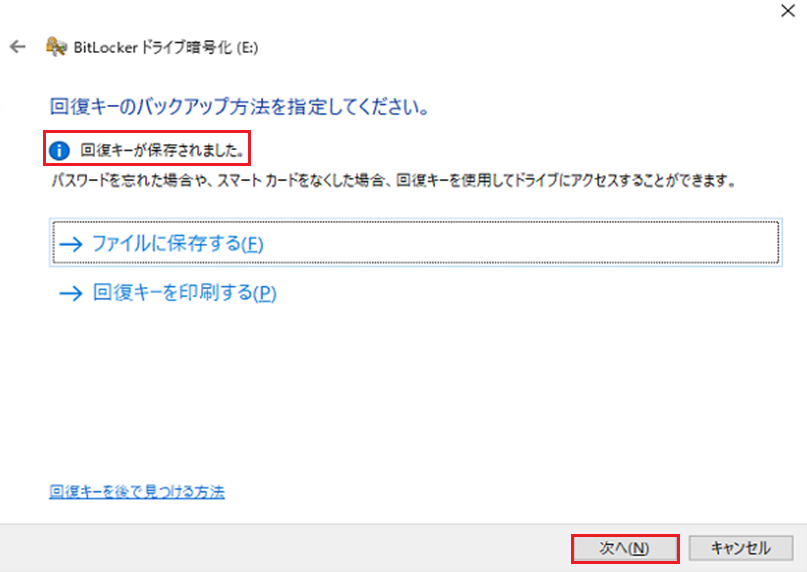 回復キーの印刷2 - 4. 『回復キーが保存されました』または『回復キーが印刷されました』と表示されたら『次へ(N)』を選択