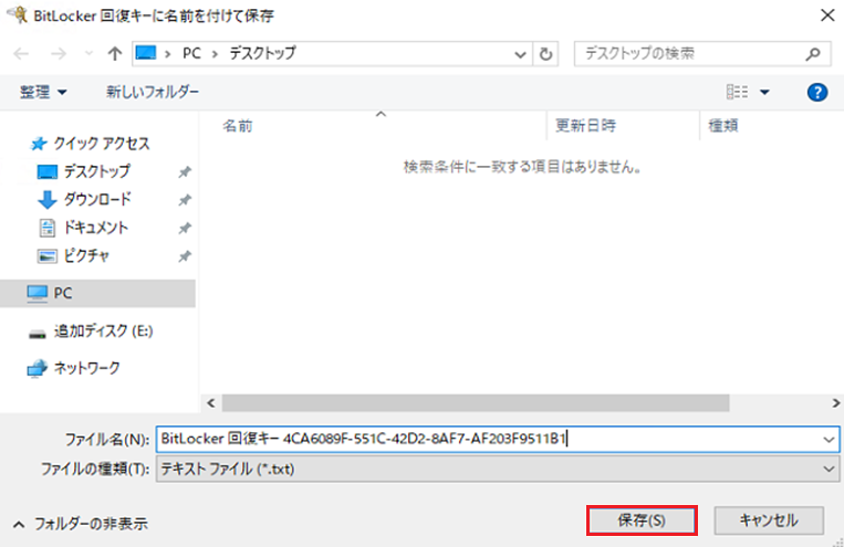 回復キー保存先選択 - 3-A-1. 暗号化対象ディスク以外を保存場所に選択後、『保存(S)』を選択
