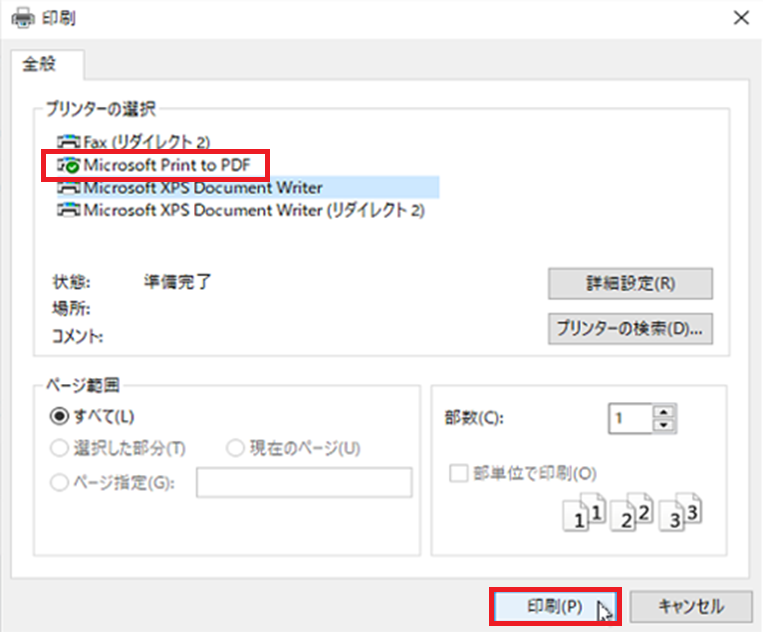 回復キーのファイル保存 - 3-B-1. 印刷で『Microsoft Print to PDF』を選択後、『印刷』を選択