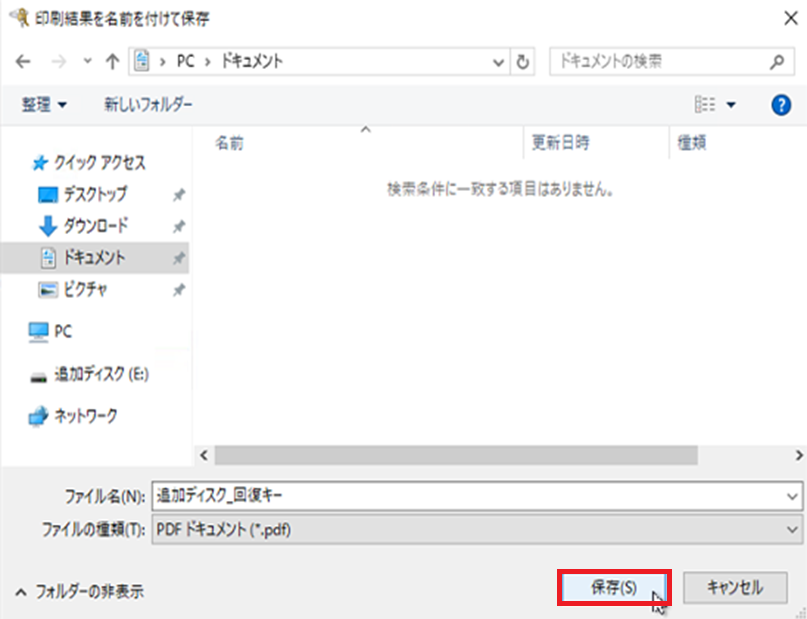 回復キーの印刷1 - 3-B-2. 任意の保存場所と任意のファイル名を指定後、『保存(S)』を選択
