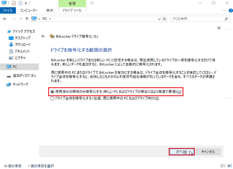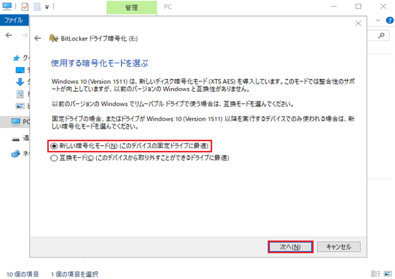 暗号化範囲の選択 - 6. 『新しい暗号化モード(N)(このデバイスの固定ドライブに最適)』を選択後『次へ(N)』を選択