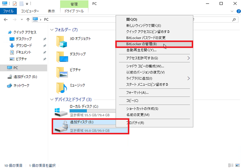 - 1. エクスプローラーを起動後『デバイスとドライブ』から増設ディスクを選択後、コンテキストメニューから『BitLockerの管理』を選択