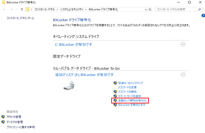 通常、ローカルディスクを暗号化せず増設ディスクのみの暗号化となる場合は自動ロック解除を使用することが出来ません。
