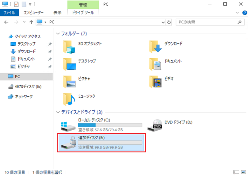 - 1. エクスプローラーを起動後『デバイスとドライブ』から増設ディスクを選択