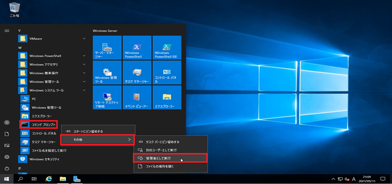 - 1. スタートメニューから『Windows システム ツール』>『コマンドプロンプト』>『その他』>『管理者として実行』を選択