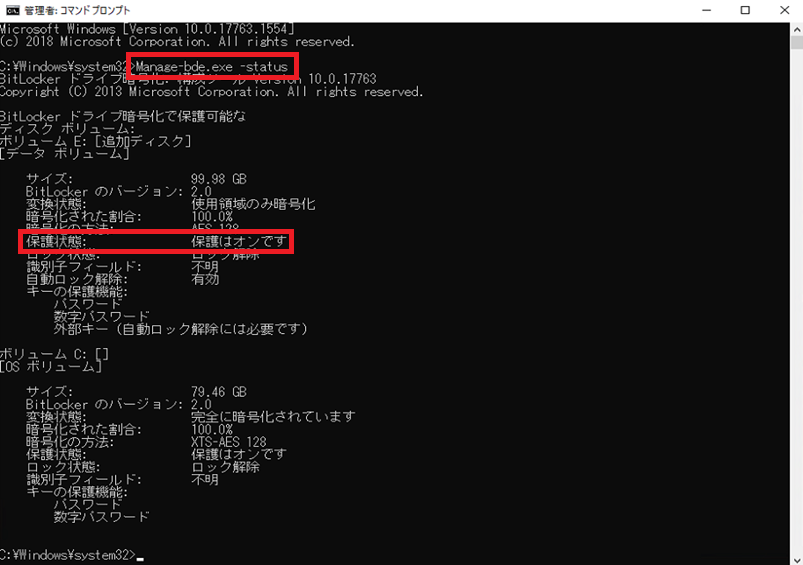(2) コマンドプロンプトを使用した保護状態確認