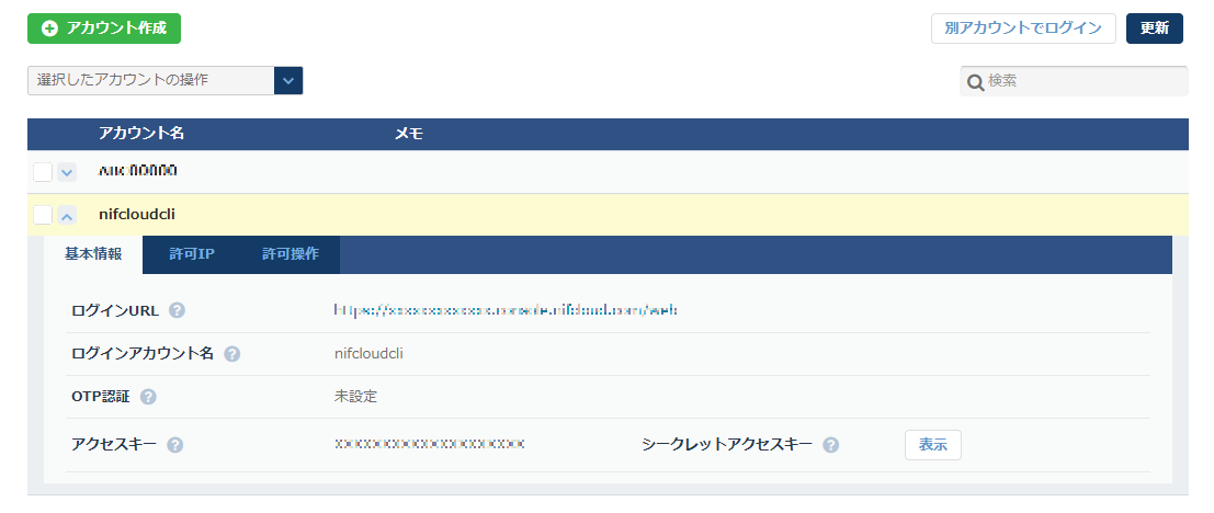 アカウント一覧から nifcloudcli の詳細を開くと、アクセスキーとシークレットアクセスキーを取得できます。