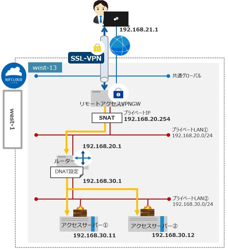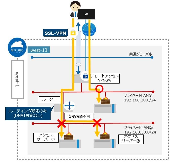 リモートアクセスVPNゲートウェイを利用して、お客様環境からFJcloud-V(旧ニフクラ)上のプライべートLANに直接接続することはもちろん問題ありませんが、さらにルーターを介して別のプライベートLANには直接接続できないという制限があります。