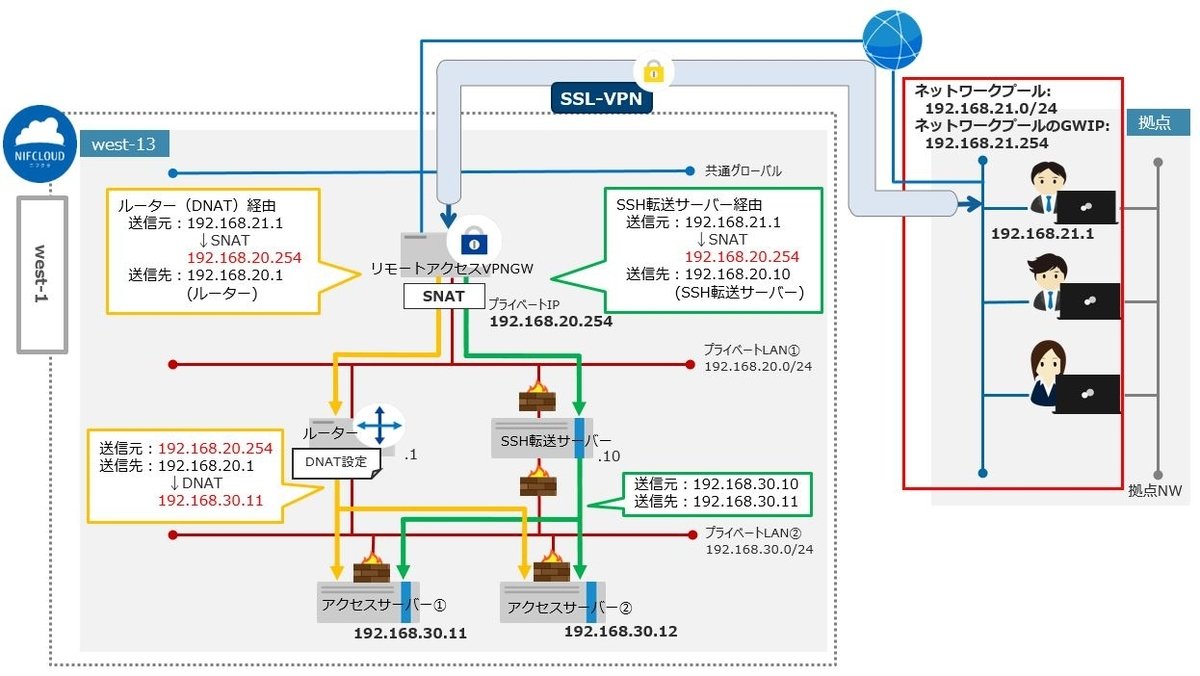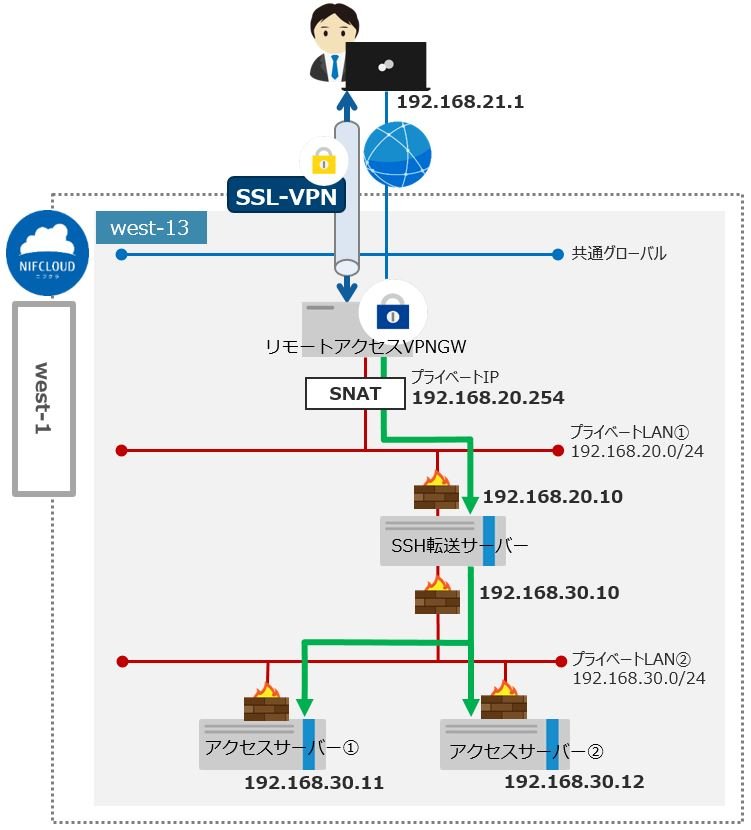 プライベートLAN②はルーターまたはSSH転送サーバー経由で接続するアクセスサーバーを配置するネットワークです。