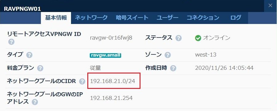 | プライベート側ネットワーク | RAVPNLAN01(192.168.20.0/24) |