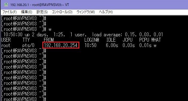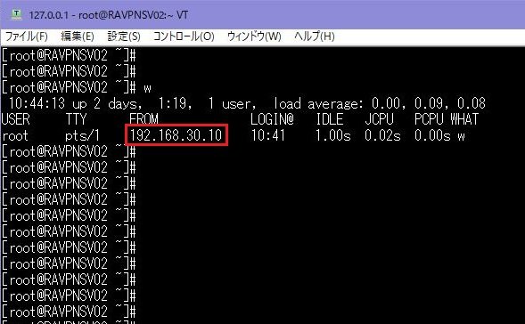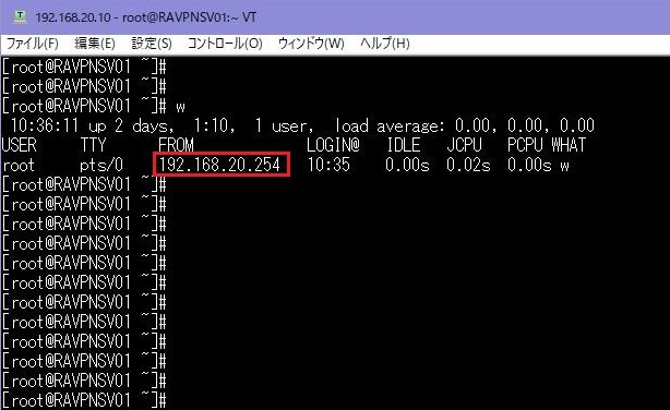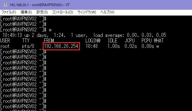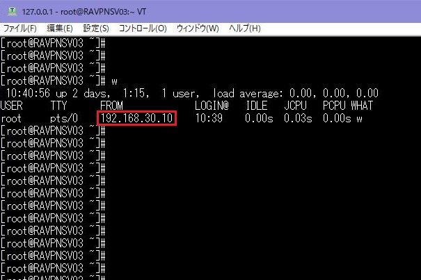 「w」コマンドで送信元のIPアドレスを確認してみます。