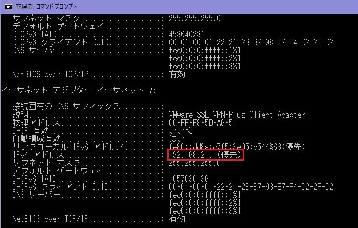 「ipconfig /all」コマンドでIPアドレスを確認します。