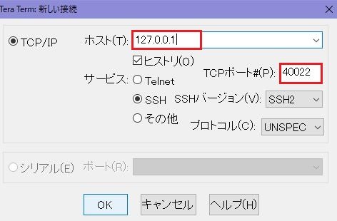IPアドレスの割り当てが確認できたら、TeraTermを起動し、SSH転送サーバーに接続します。