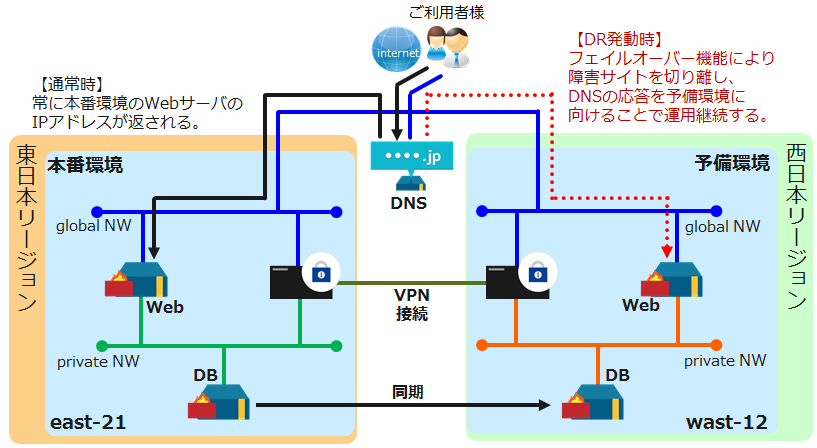 東日本大震災以降、災害などからのシステムの復旧および有事に備えるための「Disaster Recovery (DR)」は多くの企業で検討される課題となっております。今回は、ニフクラの東西それぞれのリージョンにおいて一般的なWEB-DBシステムを作成し、DNSを用いたウォームスタンバイのDR構成を構築し、検証を行いました。
