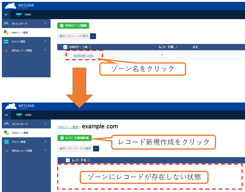 - 1. ニフクラの左メニューから「DNSゾーン管理」を選択する。レコードを設定するDNSゾーン名を選択するとレコード一覧画面が開くので、左上の「レコード新規作成」をクリックします。