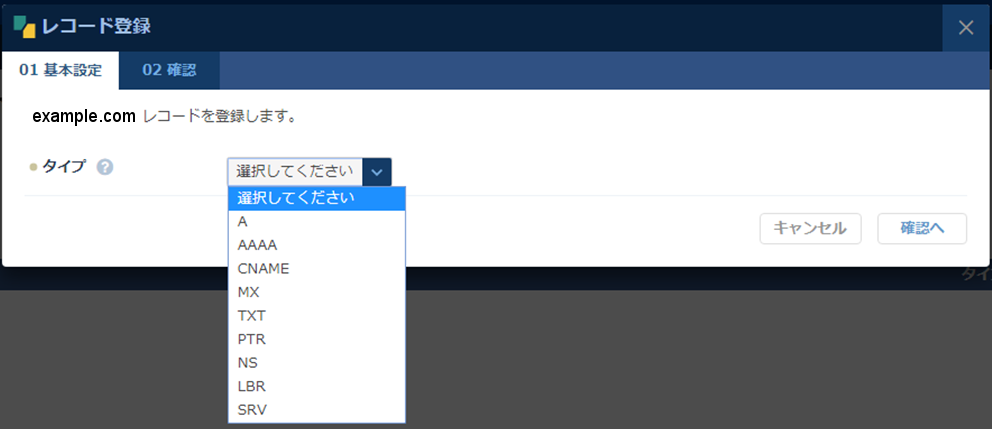 - 2. 登録したいレコードのタイプを選択します。今回はAレコードを選択します。