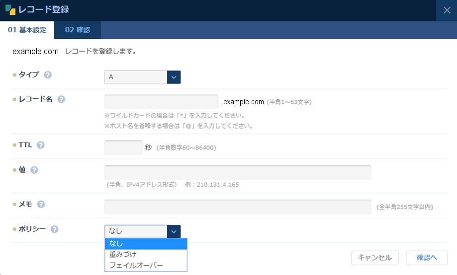 - 3. レコード登録の基本設定画面が現れます。各欄に情報を入れた後、一番下の「ポリシー」タブを選択して「フェイルオーバー」を選択します。