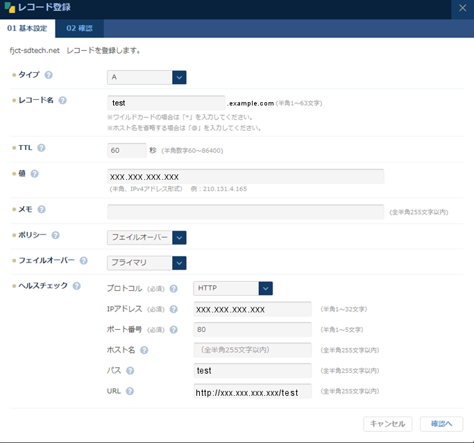 | レコード名 | 対応サーバー名 | フェイルオーバー設定 | TTL |