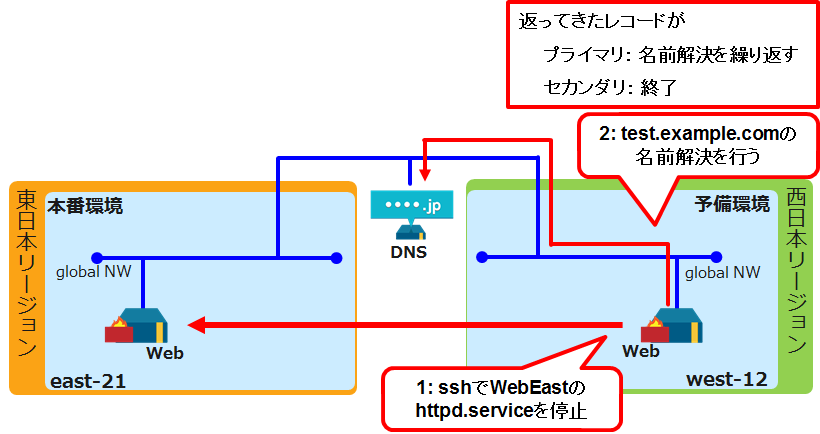 プライマリが返ってきた場合は、WebEastへの死活監視がまだ行われていない状態であるため、名前解決を繰り返します。
