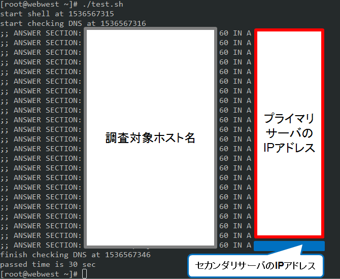 上記手順に従い、WebEastのhttpd.serviceが停止してさせてからDNSがセカンダリのレコードを返すようになるまでの時間を秒単位で計測しました。図3に示すものが実際の実行画面となります。
