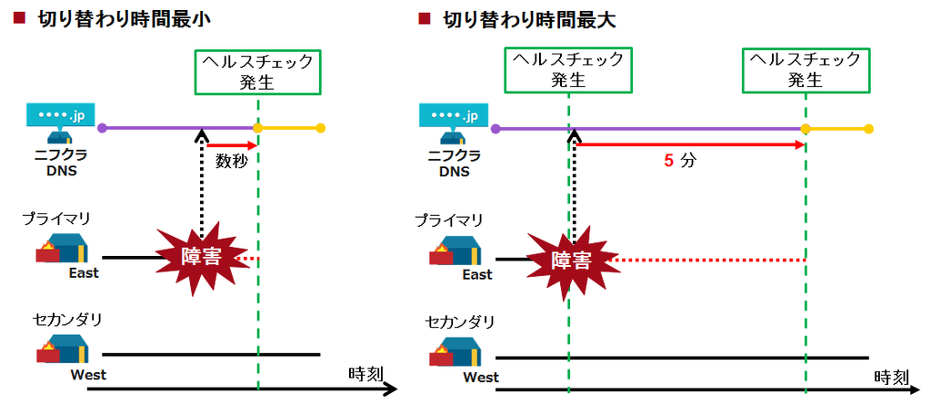 ヘルスチェックは5分毎にプライマリサーバーに対して行われます。そのチェックでサーバーが正常に動いていればプライマリのレコードを、サーバーが異常であれば予備環境のセカンダリレコードを返します。