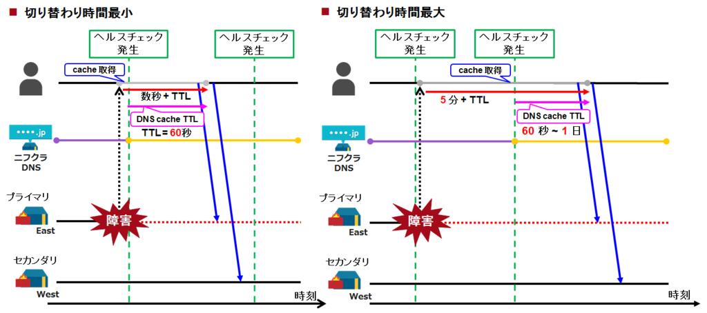 さらに、ユーザーアクセスがセカンダリに変わるまでに要する時間はおよそ60秒\~24時間5分であることが分かります(図7)。 ただし、最大値の24時間というはレコードのTTLを意図的に最大値(24時間)に指定した場合であり、デフォルトでは60秒です。したがって、大半のユーザーは最大6分待つことでセカンダリレコードより予備環境へアクセスできるようになります。