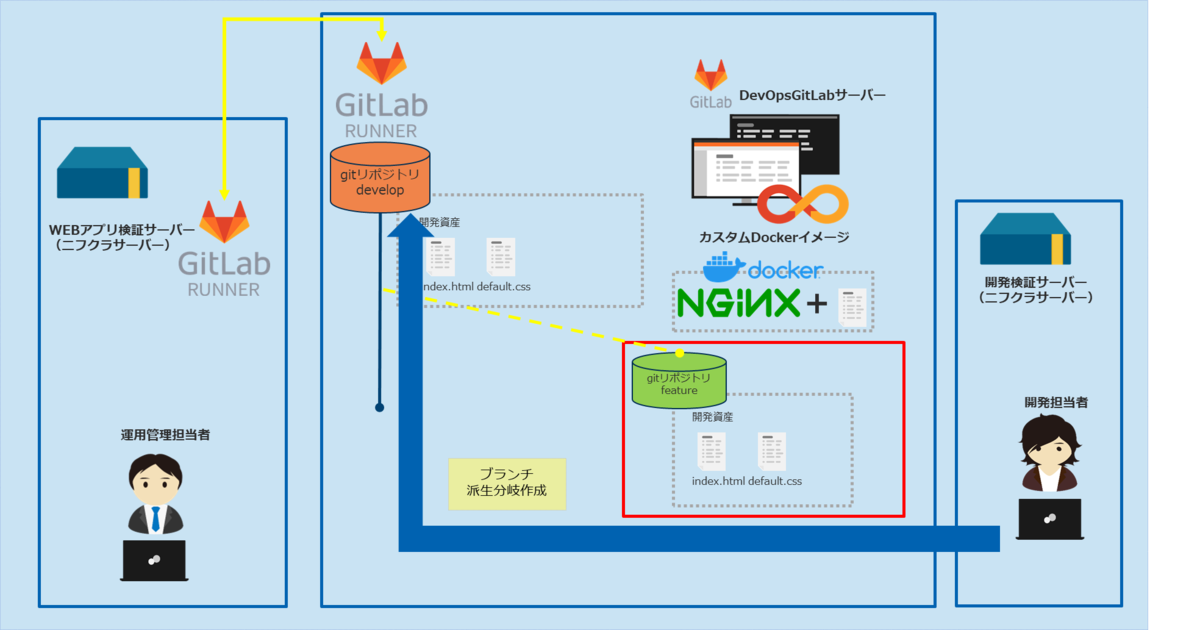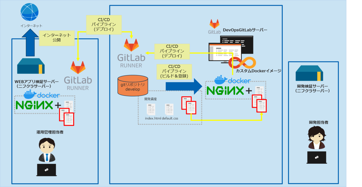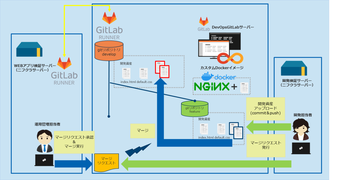 以下④~⑦にて、運用管理者のマージリクエスト承認~承認後の自動化されたCI/CDパイプライン実行からWEBアプリ検証サーバーへのデプロイ工程を検証&解説します。