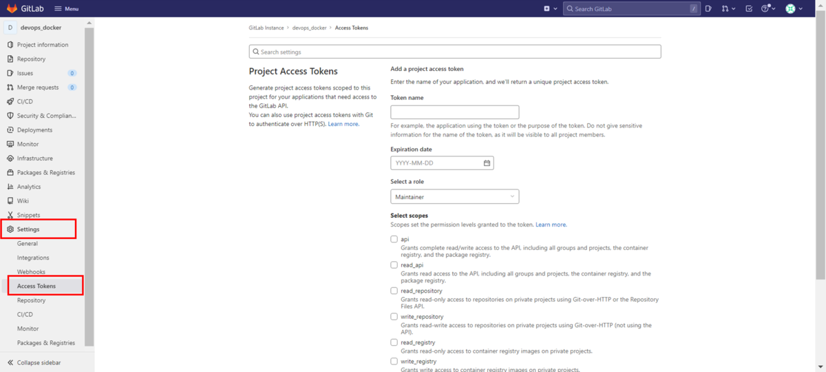 開発検証サーバーからDevOps with GitLabサーバー上のリポジトリにアクセスするために gitリポジトリアクセストークンを発行します。 作成したプロジェクトに移動して「Settings」→「Access Tokens」を選択します。