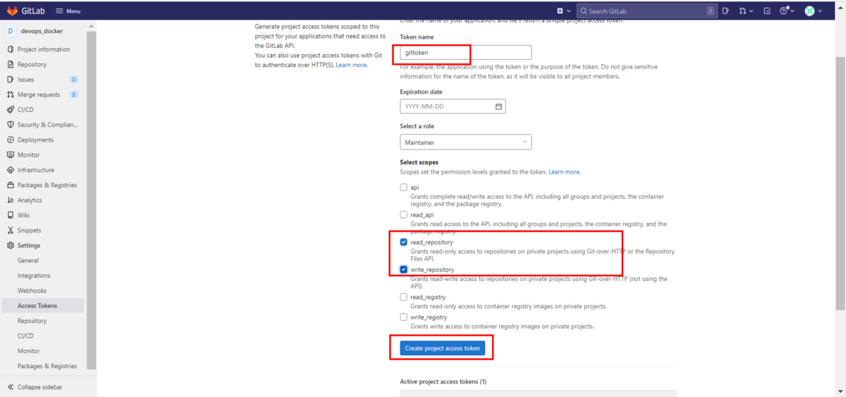 「Token name」にトークン名を設定して、「read_repository」、「write_repository」 を選択して「Create project Access token」ボタンをクリックします。