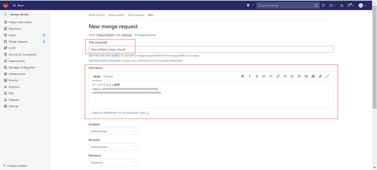 マージリクエストのタイトル、マージリクエスト説明文等の内容を入力します。