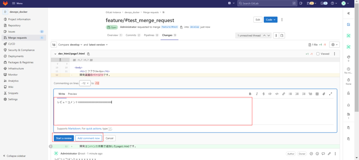 発行したマージリクエストにコメントが追加されます。 開発担当者はコメント内容を参照して修正作業等を実施します。