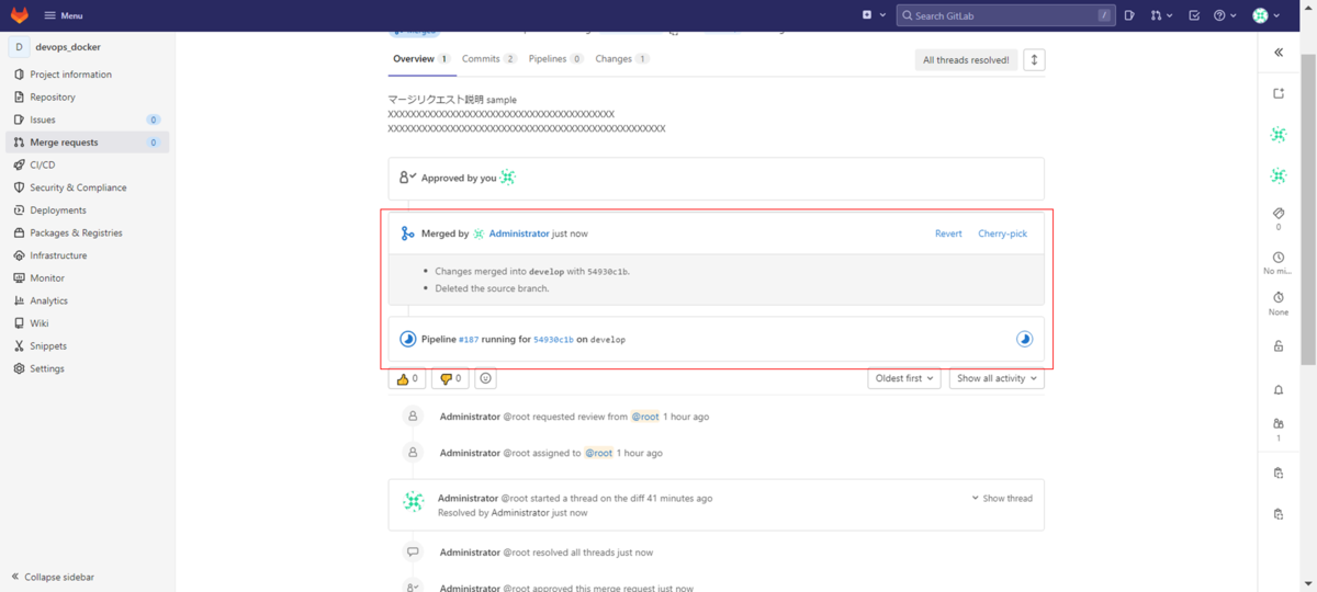 運用管理者がレビューを実施して問題がなければマージリクエストを承認してマージを実行します。