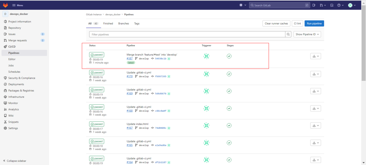 featureブランチのdevelopブランチへのマージが実行されて、マージ後にCI/CDパイプラインが実行されます。